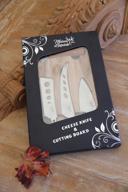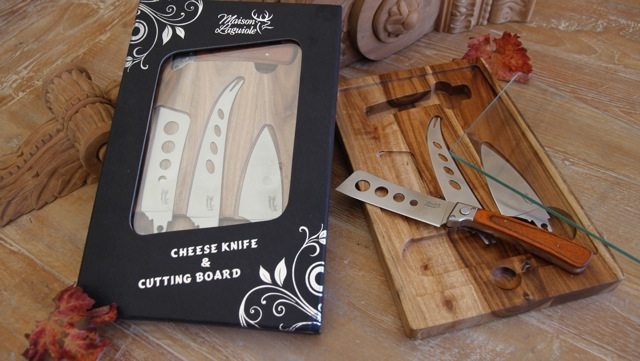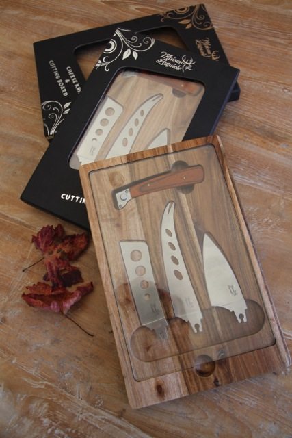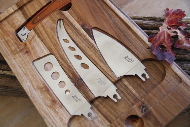 A beautiful Cheeseboard in acacia wood.The cheese knife come one handle and 3 interchangeable blades, made in high quality steel. It also comes with a safety glass. You can serve your cheese and you still can see the timber and knives under.